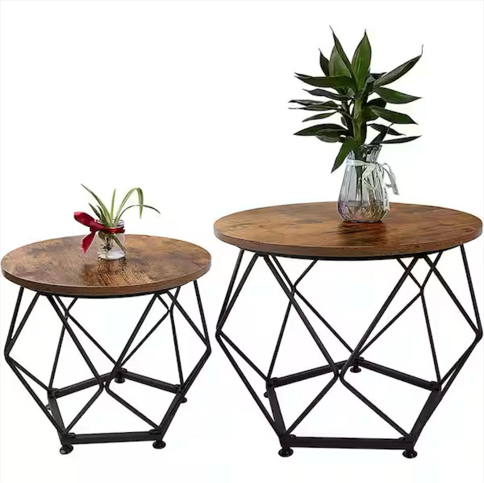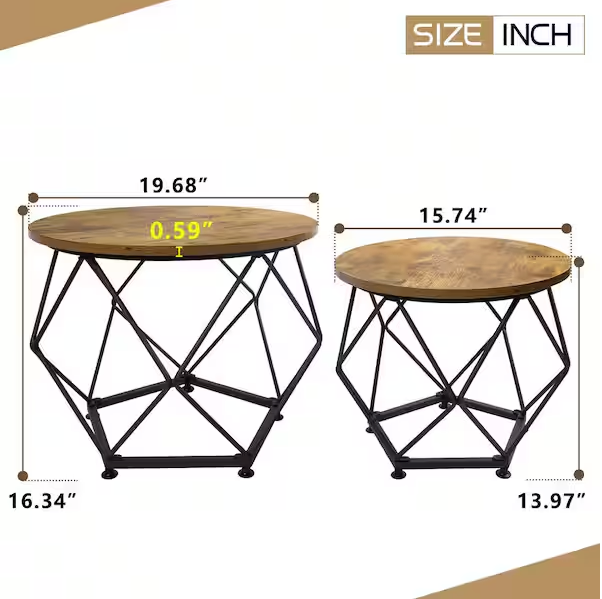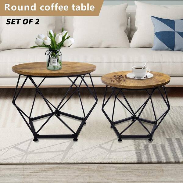 This coffee table set is designed to transform your living space for more comfortable and relaxing time. All living room table set choose selected and classic colors to match, combine with round tops and geometric x bases, very stable and not easy to get hurt, always gram up your living room and catches your guests' eyes. This table top of this circle coffee table set is made of dense density board and its appearance is beautiful, stain-resistant and easy to clean. The geometry bottom is very stable and can withstand a w8 of 110 lbs. This 2-pieces coffee table set with 1-pieces size of 19.7 in. Dia. x 15.7 in. H and the other small pc size of 15.7 in. Dia. x 14.2 in. H. The clean wood grain surface is very convenient and expand lot of space to use and store your easy to acess items like book, snacks, suitable for family use.